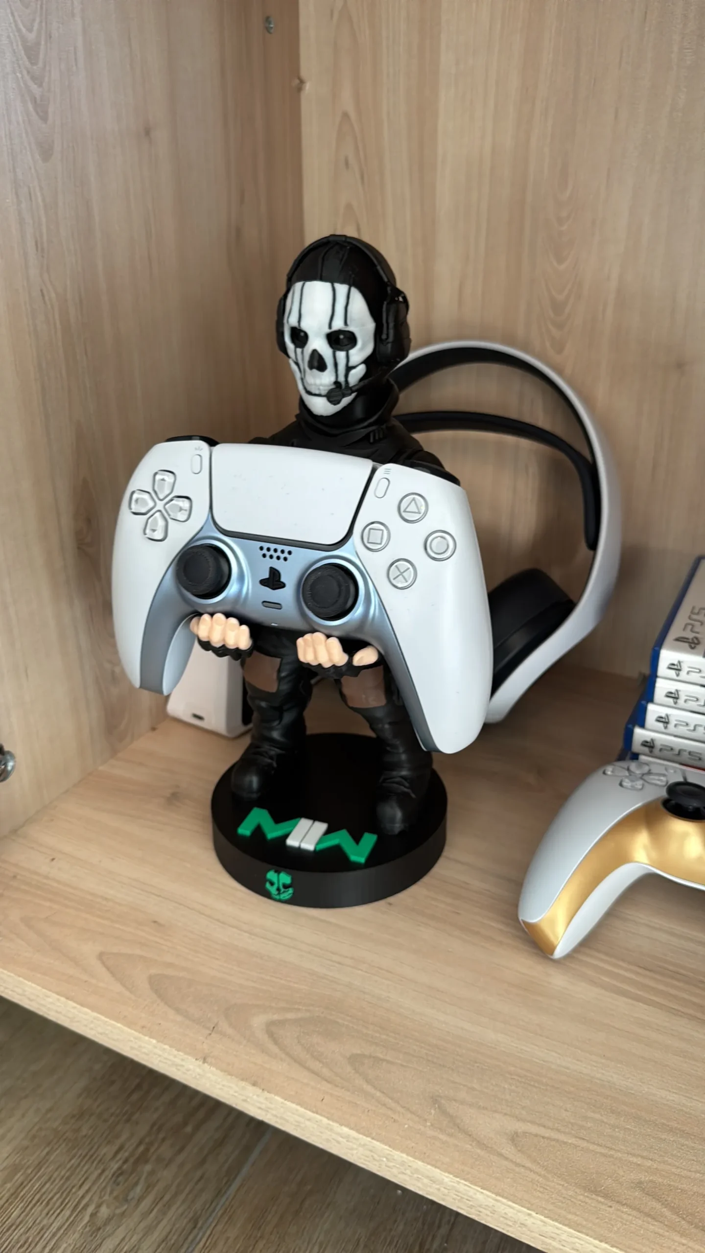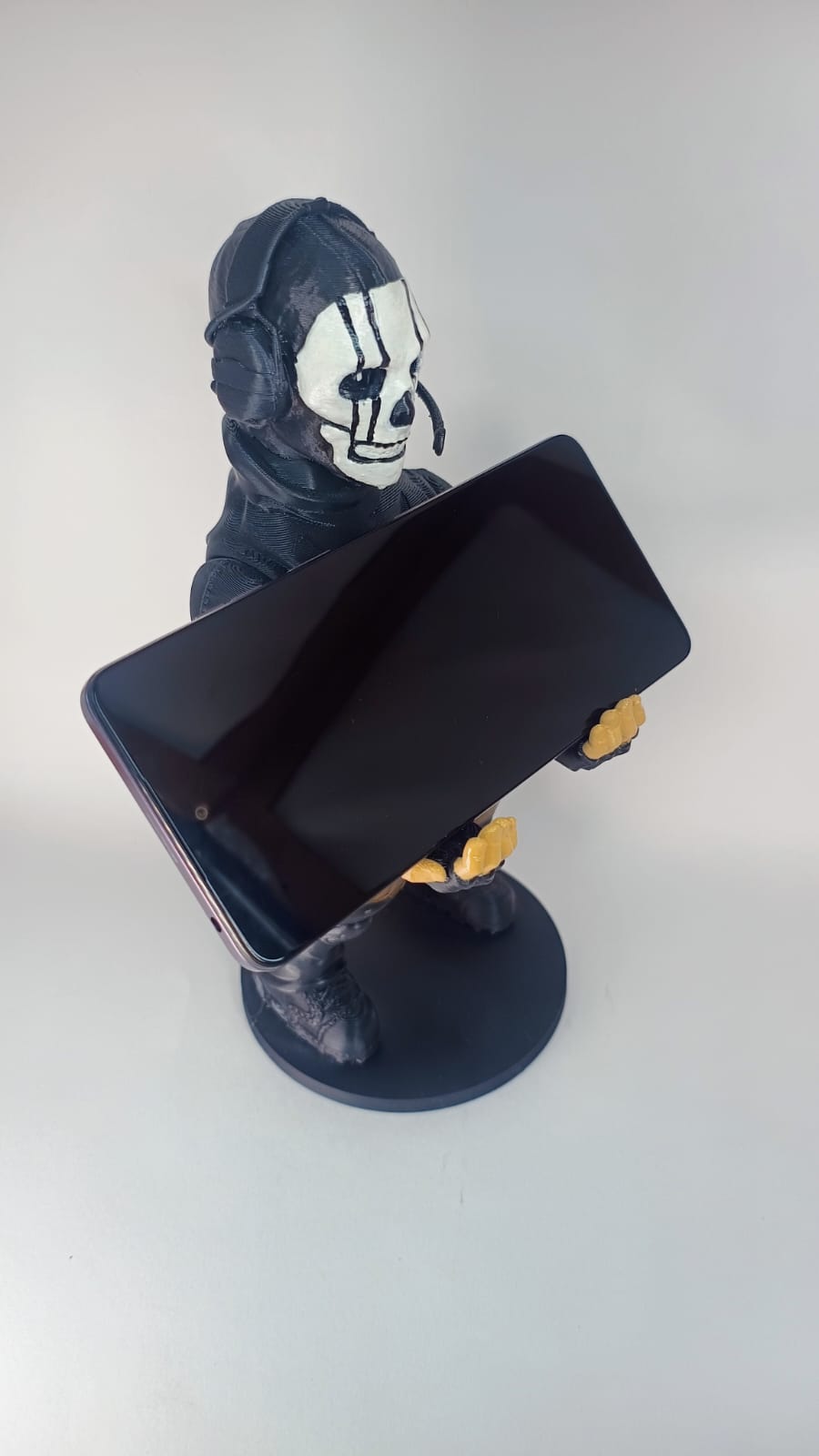 Fabricado con tecnología de impresión 3D de alta densidad, cada pieza presenta un nivel de detalle excepcional: desde las texturas de la icónica máscara de calavera y los auriculares tácticos, hasta los pliegues del uniforme de combate. Su base robusta garantiza una estabilidad total, permitiéndote descansar tu control (PS5, Xbox, Switch) o smartphone de forma segura mientras no estás en combate.
